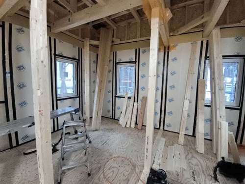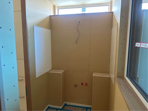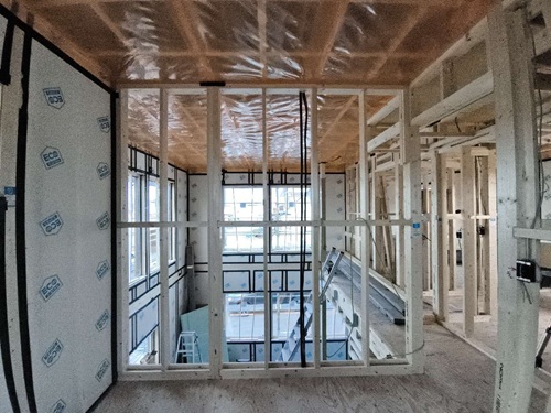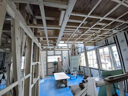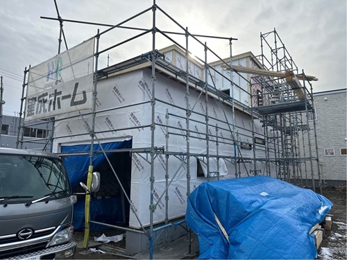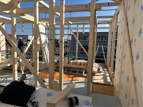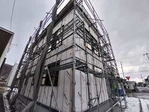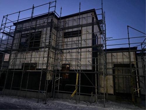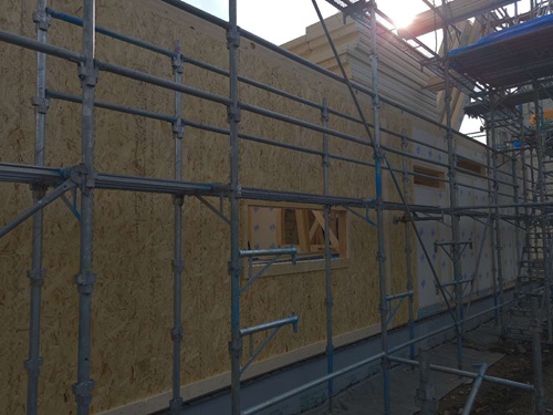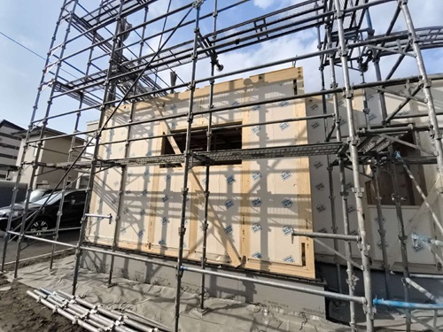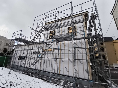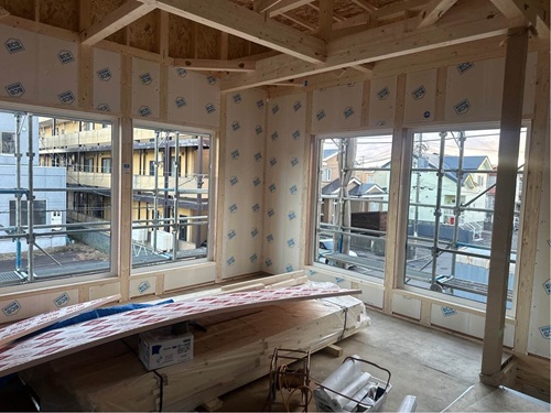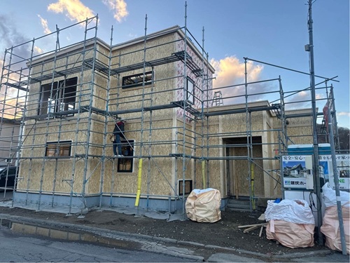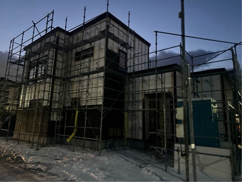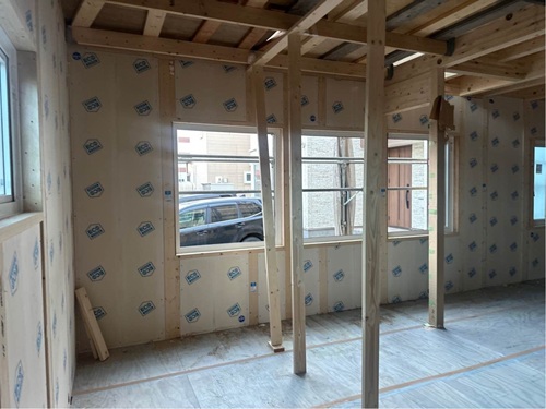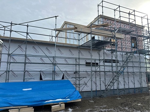 建物外部では、透湿防水シートを貼っています。