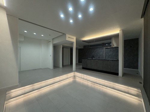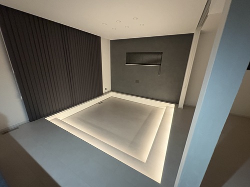 ダウンリビングの段差に仕込まれたライン照明が、空間に奥行きと圧倒的な高級感を与えていたのです。