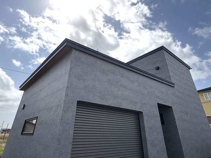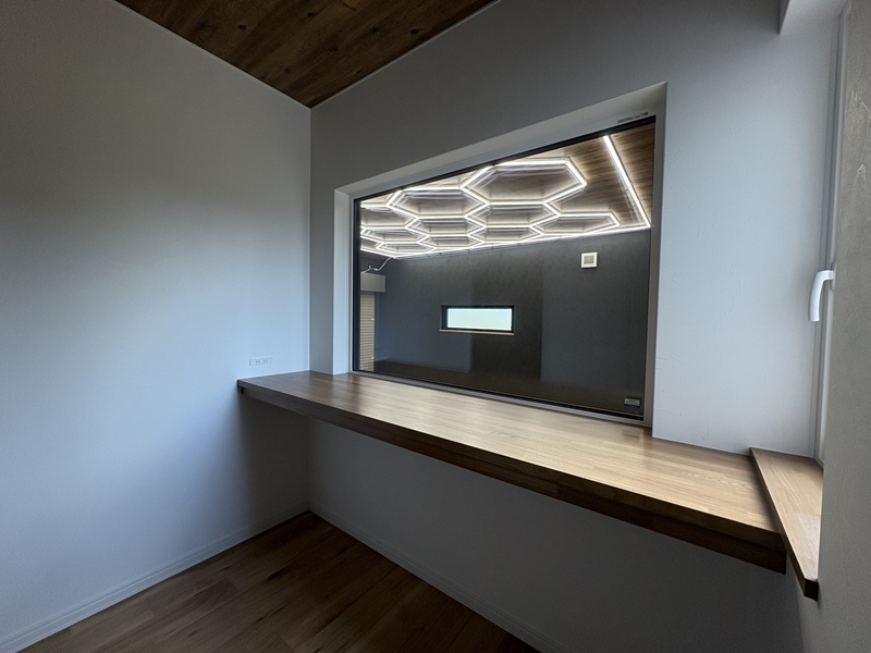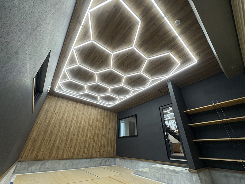 ・HEXaEDのLEDが印象的な、開放感あふれるガレージ。