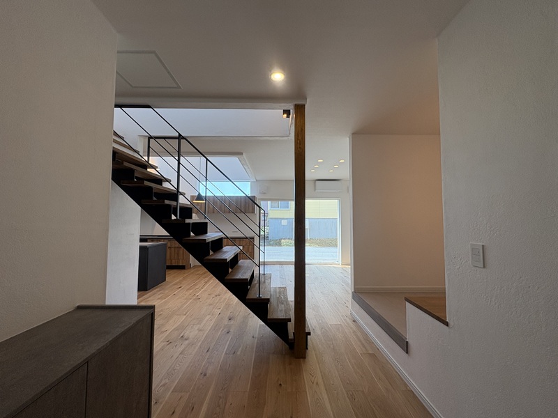 ・玄関からつながる鉄骨階段と吹抜けのあるLDK。