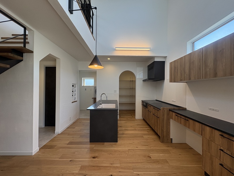 鉄骨階段から広がるLDKや、二の字キッチン・大容量パントリーなど、暮らしやすさにもこだわりました。