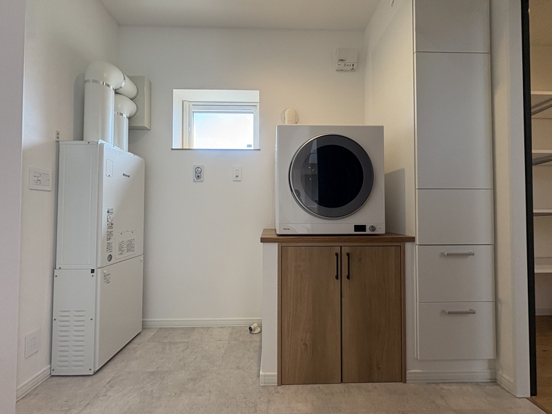 ・造作洗面と「乾太くん」を備えたユーティリティ。