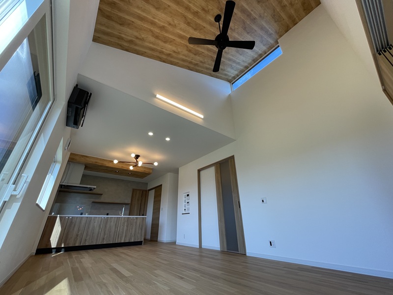 ~リビングは吹き抜け天井で驚くほどの開放感。木目クロスを効果的に使用することで、ただ広いだけでなく、落ち着きがありおしゃれな大人の空間に仕上げました。フラット対面キッチンからは、家族との会話を楽しみながら、空間全体を見渡せます。